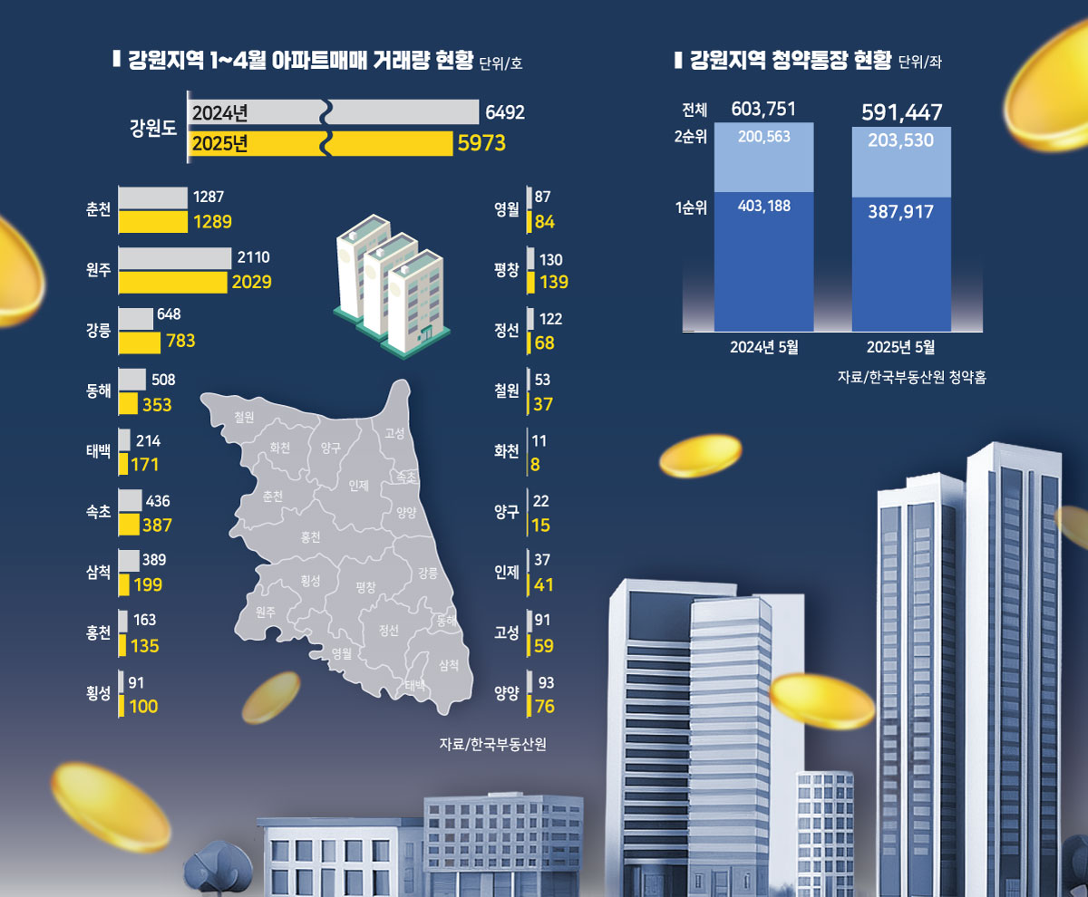 올 상반기 강원지역 아파트 거래 시장은 움츠러든 분위기다. 한국부동산원 행정구역별 아파트매매거래현황을 보면 1~4월 도내 아파트매매거래량은 5973건으로 지난해 같은기간(6492건) 대비 519건(8%) 감소했다. 지역별 온도차도 뚜렷했다. 수도권과 가까운 춘천의 경우 같은기간 1287건에서 1289건으로 소폭 상승했고 원주는 2110건에서 2029건으로 소폭하락 하는 등 큰 차이를 보이지 않았다. 강릉의 경우 동해선 개통으로 인한 기대감으로 648건에서 783건으로 20.8% 거래량이 늘었다.