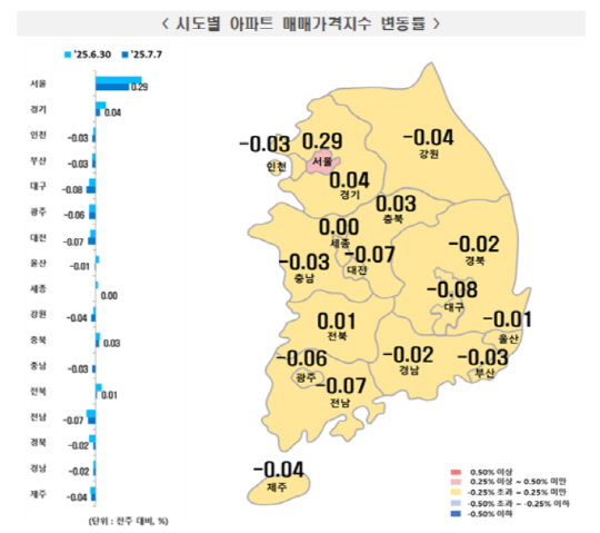 같은 기간 수도권은 0.17%에서 0.11%로 상승 폭이 축소됐고, 지방은 -0.02%에서 -0.03%로 하락 폭이 확대됐다.
